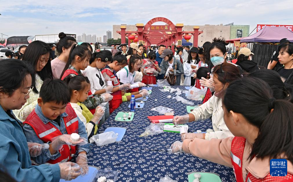 9月15日,市民和游客在红旗大集上制作月饼。