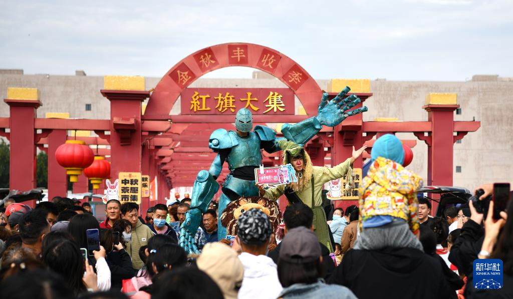 9月15日,市民和游客在红旗大集上观看表演。