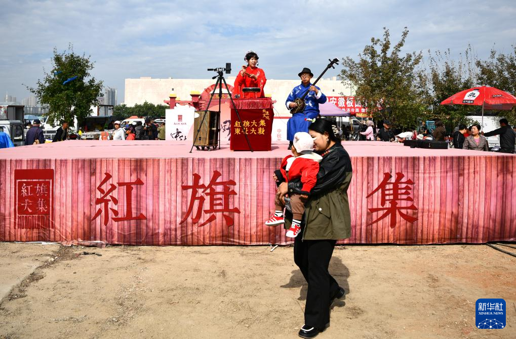 9月15日,市民和游客在红旗大集上观看舞台上表演的东北大鼓。