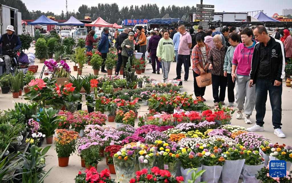 9月15日,市民和游客在红旗大集上选购鲜花。