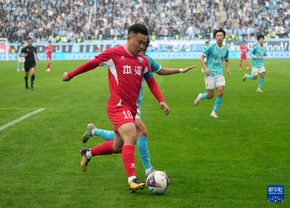 11月15日,本溪队球员杨健(前)在比赛中拼抢。