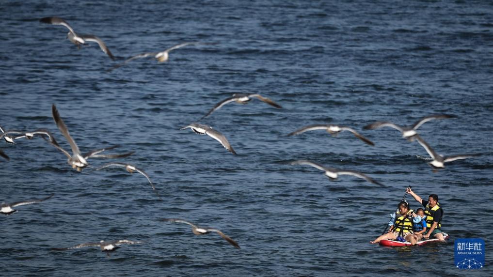2025年7月10日,游客在大连傅家庄公园海域划桨板。新华社记者 潘昱龙 摄