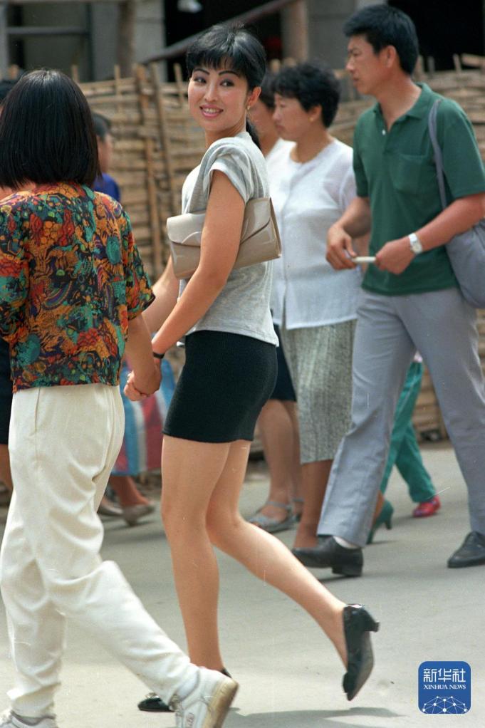 1991年9月,一名身着超短裙的女孩走在大连街头。新华社记者 张小龙 摄