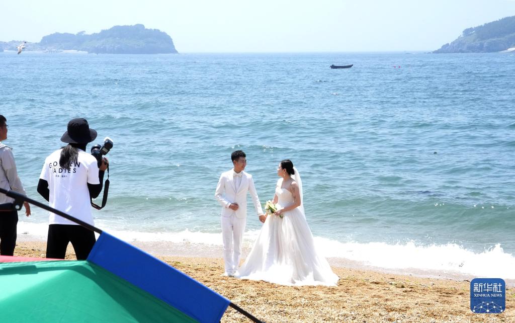2024年6月17日,一对新人在辽宁大连傅家庄公园的海边拍婚纱照。新华社记者 章磊 摄