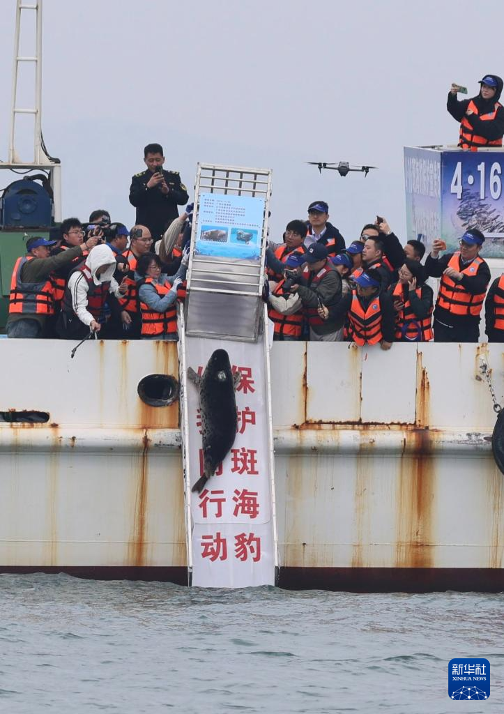 4月16日,工作人员将斑海豹放归大海后,斑海豹在海面上游动(无人机照片)。